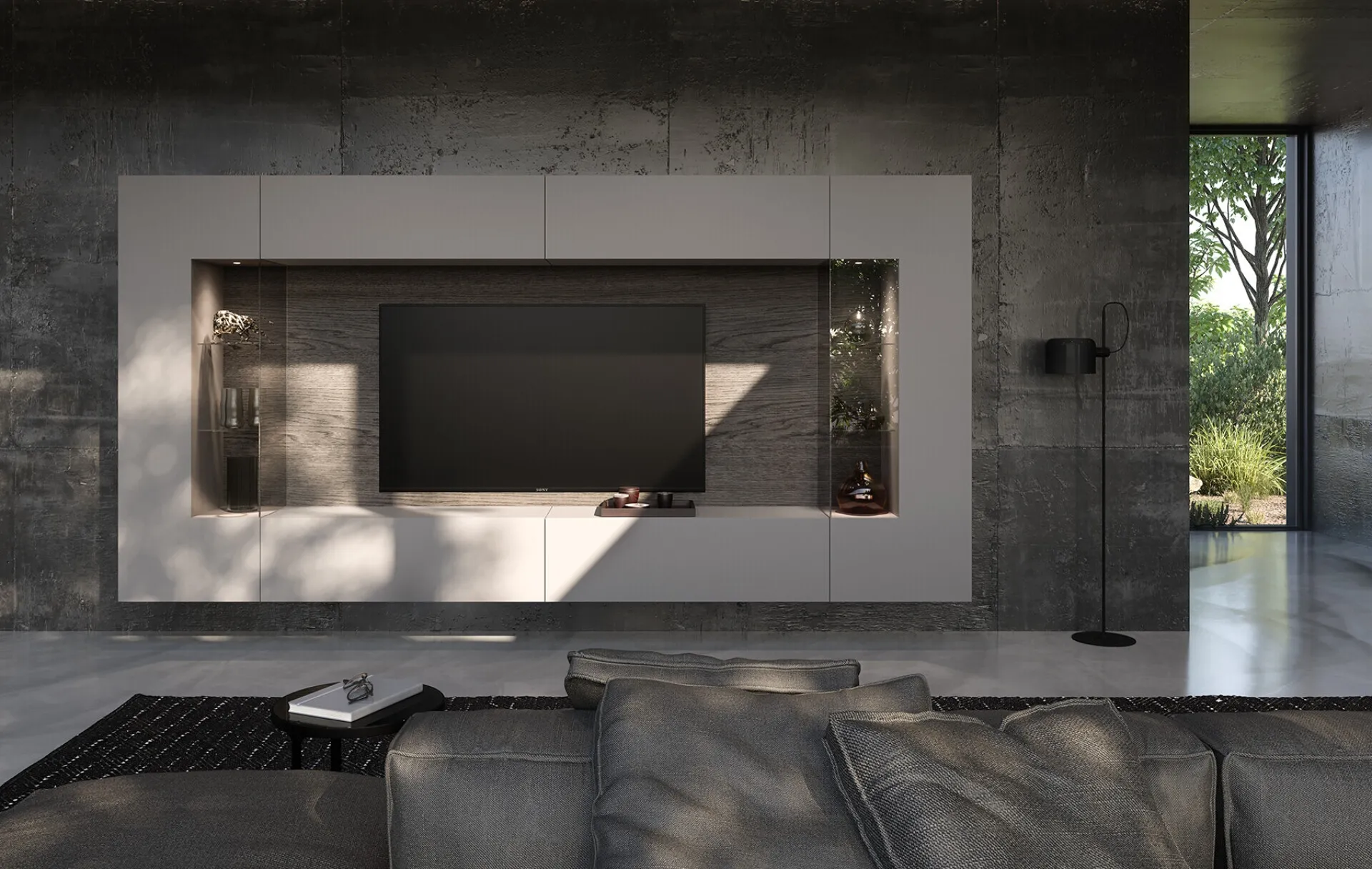 Se vuoi completare un living pratico e operativo dalle linee moderne, ti presentiamo la parete attrezzata Soggiorno con schienale dietro vetrine Voltan.